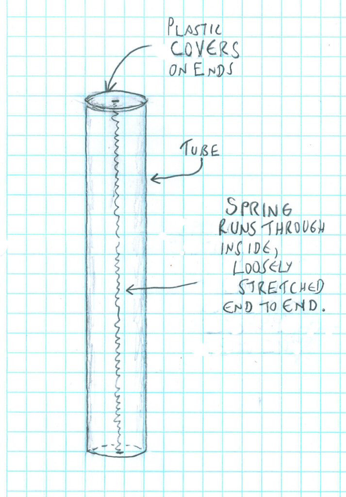 To start this discussion, let’s imagine a simple instrument for spring sounds, designed as follows: Picture a device consisting of a lightweight coil spring running through a cardboard tube of two or three feet long. Covering each end of the tube is a plastic diaphragm, and the ends of the spring are anchored to these. With this arrangement, when you excite the spring into vibration, the springy sounds are transmitted to the diaphragms which then act as soundboards to send the sound out into the air. You can excite the spring just by shaking the tube; this causes the spring to bang around against the tube walls. You can also sing into one of the diaphragms, which will pick up the vibration from the air and transmit it to the spring for a nice reverb.* And so, right off the bat we see that springs can serve either as primary vibrating bodies, as when the spring bangs against the tube wall, or they can serve to add reverberation to another primary sound source, in this instance, a voice. We’ll see many examples of both before this article is finished.