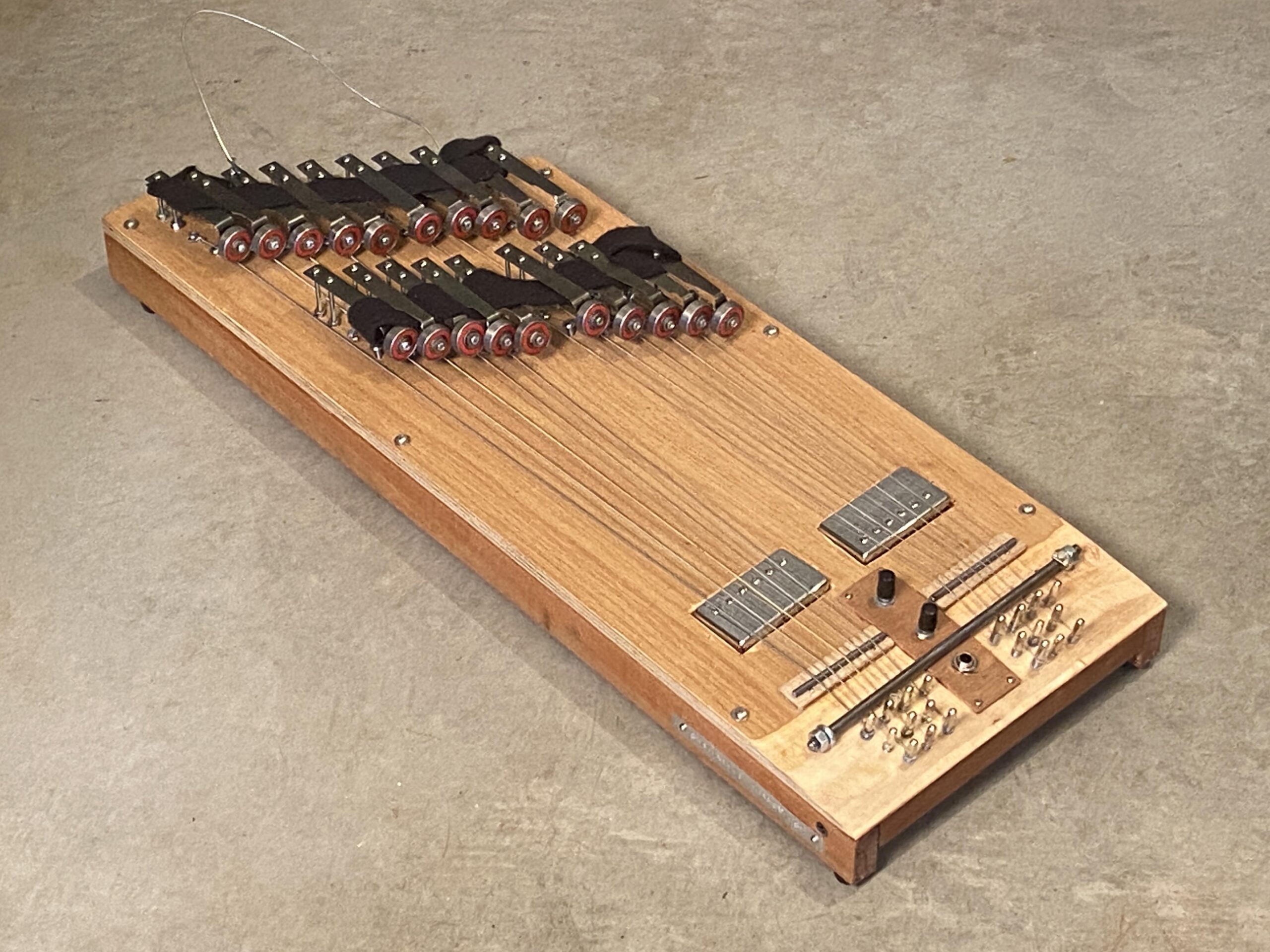 On this 20-string zither, the strings are sounded by small wheels rotating against them for a friction sound. The wheels are spring-mounted so that in rest position they hover over the strings. With a single motion atop the wheels the player presses them down and rotates them against the strings.